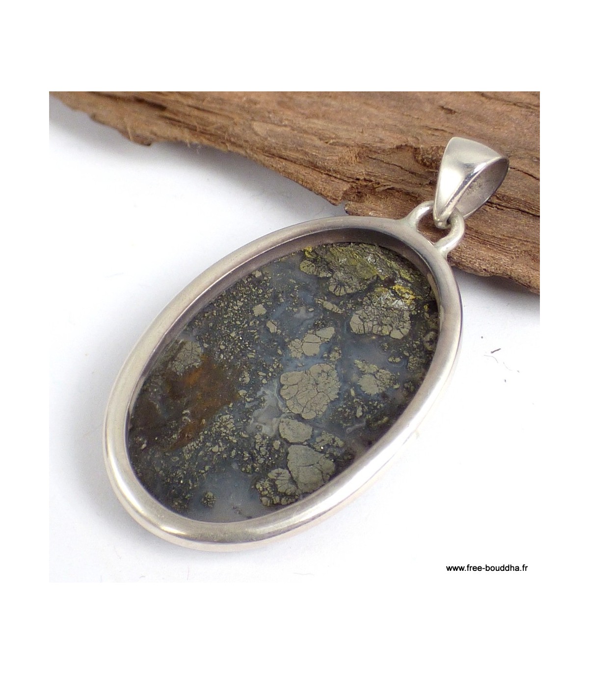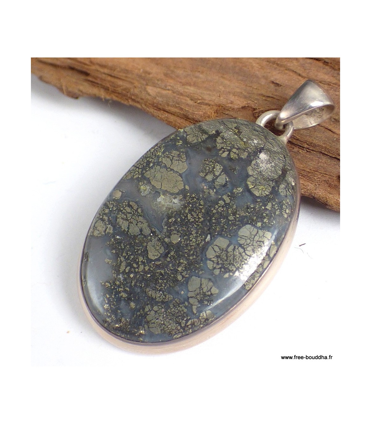 Ce pendentif exceptionnel met en valeur une pyrite naturelle à l’éclat métallique doré, déposée sur une agate gris bleutée, formant une composition minérale rare et fascinante. La pierre est taillée en forme ovale et sertie sur une monture en argent massif 925 poinçonné, garantissant qualité et durabilité.