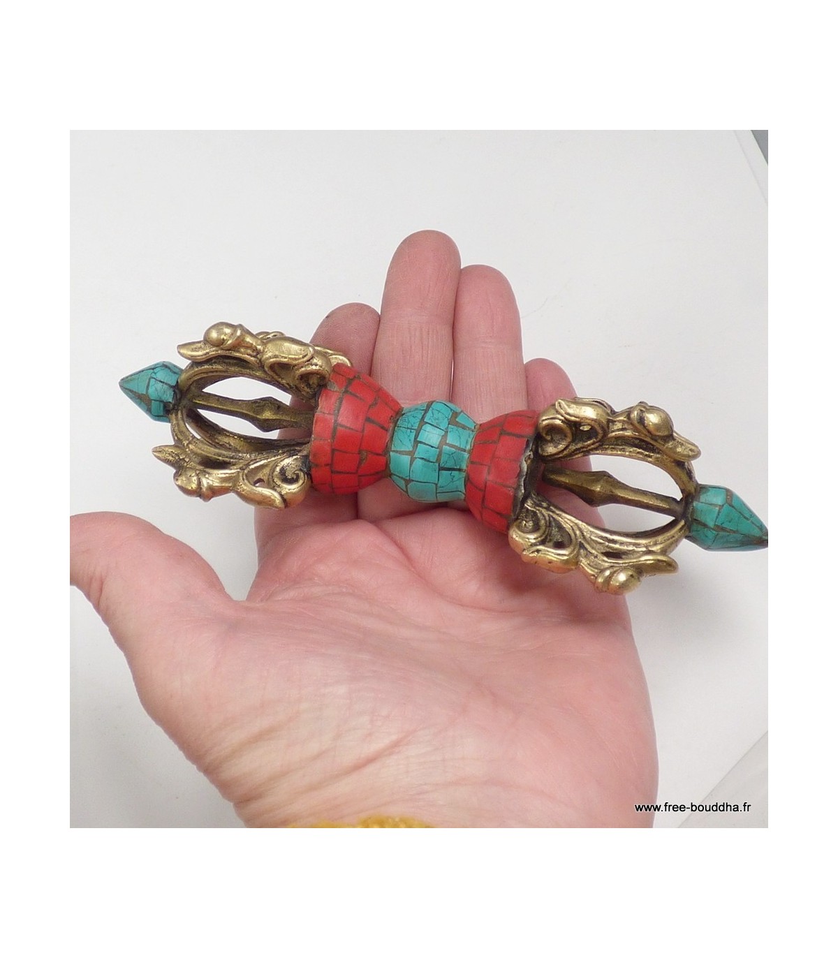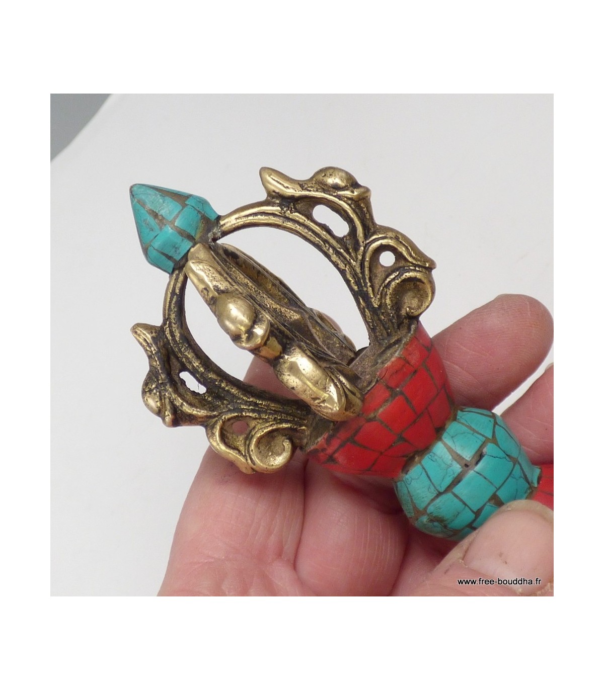 Vajra couronne bouddhiste 15 cm – Dorjé tibétain serti de turquoise et corail naturels
