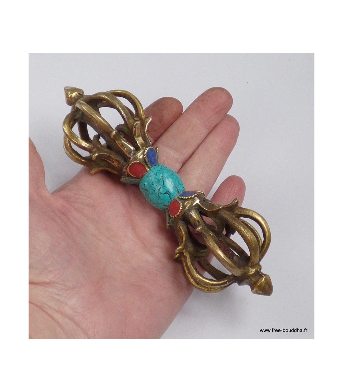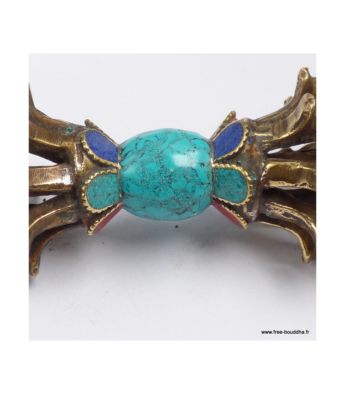 Ce dorjé vajra tibétain en laiton massif, serti de pierres naturelles et fantaisie, est une pièce rituelle traditionnelle façonnée au Népal. Sa structure élaborée et la présence de ses huit branches en font un objet symbolique puissant, utilisé pour harmoniser l’énergie, renforcer la clarté intérieure et accompagner les pratiques méditatives ou tantriques.
